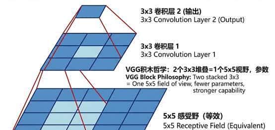 熟悉元素:它没有花哨的结构。它就像用同一种乐高积木——3×3的小卷积核——反复堆叠而成。意外创新(洞察):在VGG之前,大家喜欢用大的卷积核(比如AlexNet用了11×11和5×5),认为大的能看得更“广”。VGG的反直觉:它用两个3×3的卷积核堆叠,来替代一个5×5的;用三个3×3的堆叠,来替代一个7×7的。