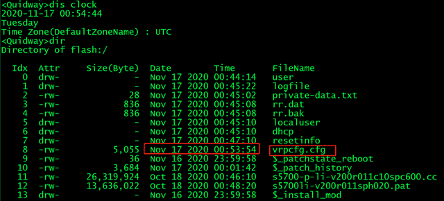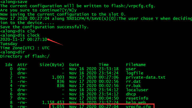 先save一下,然后查看一下时间,最后dir查看一下“配置文件”的名字,华为配置文件的后缀默认为.cfg