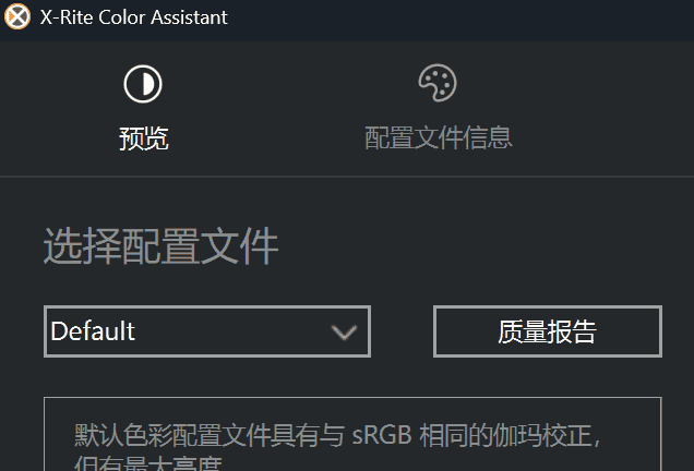 X-Rite默认配置为Default,如下图。此配置与sRGB具有相同的伽玛矫正,且有最大亮度,是联想电脑出厂的默认颜色配置。