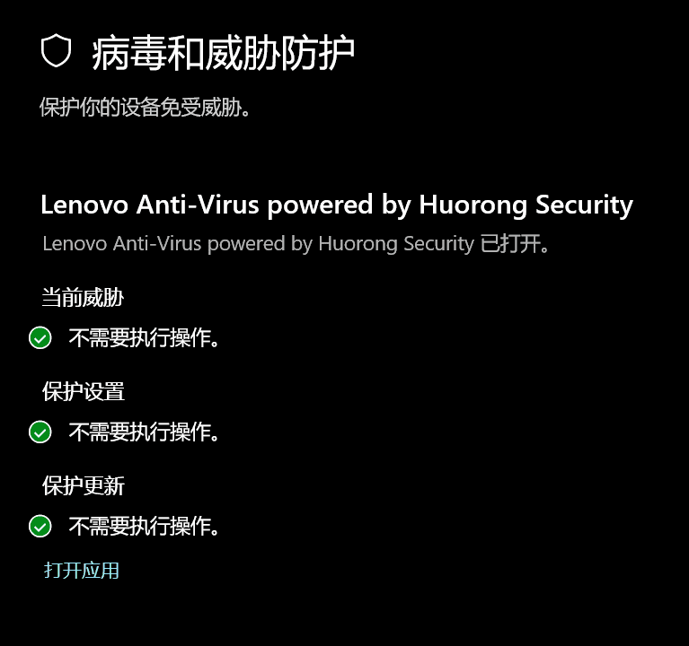 此时,由于联想电脑管家正在运行,Windows Defender会自动关闭,被联想电脑管家接管,如下图: