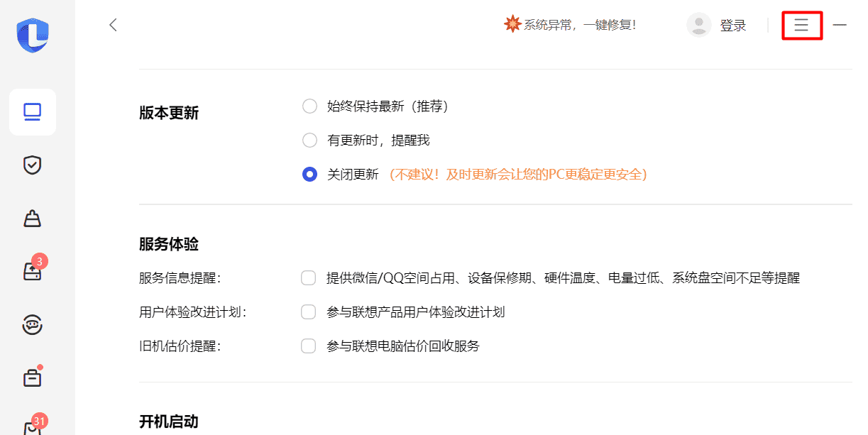 进入联想电脑管家的,关闭