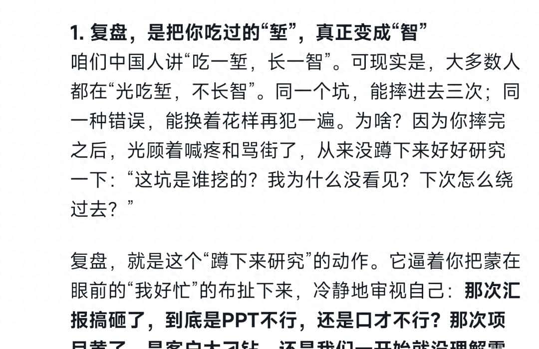由于没有复盘的努力,简直就是一场大型的自我感动。你吭哧吭哧搬了一年砖,却从不看图纸,不研究怎么搬更省力,最后除了腰肌劳损和一身疲惫,还能剩下啥?