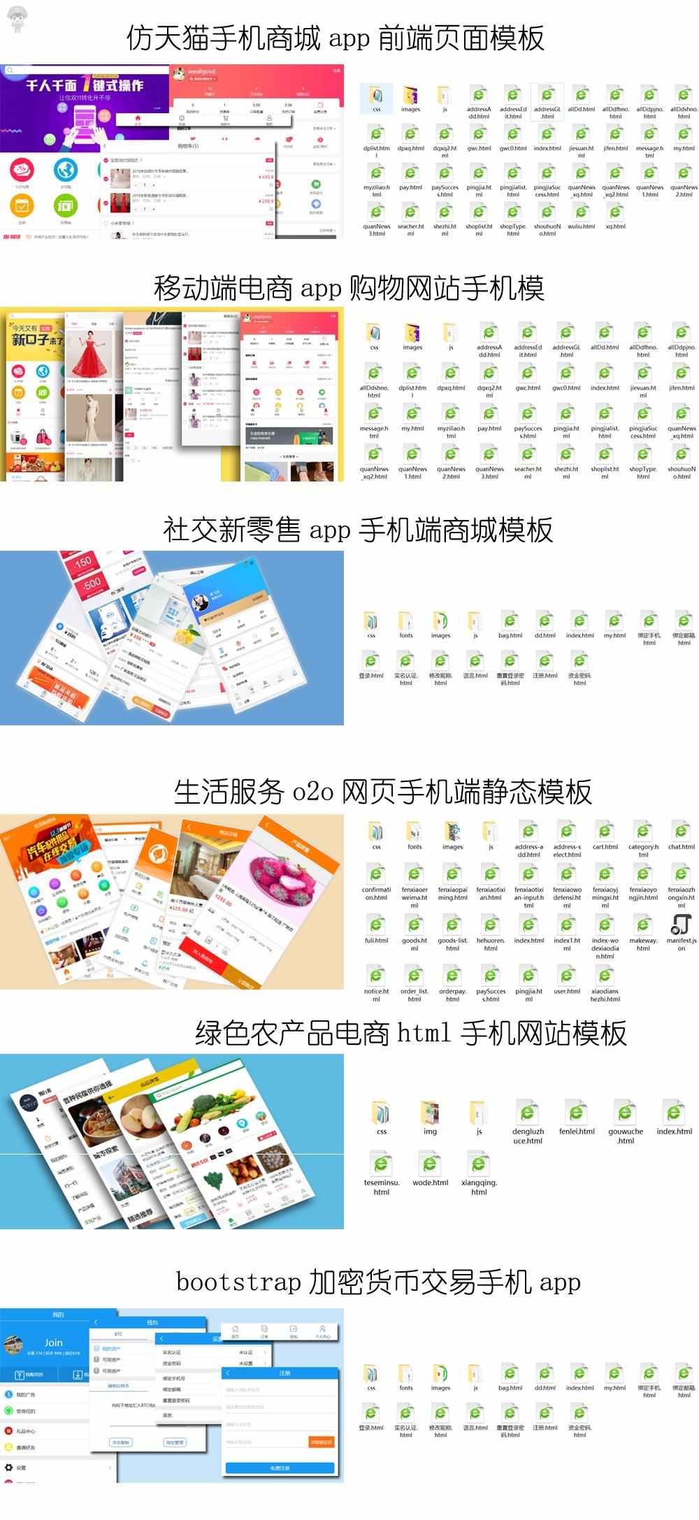 24小时自动发货客服在线时间08:00-23:00付款后30秒内自动发送下载地址到聊天窗口商品是前端代码,非专业人士不建议购买 仿天猫手机商城 app 前端页面模板移动端电商 app 购物网站手机模板社交新零售 app 手机端商城模板生活服务 o2o 网页手机端静态模板绿色农产品电商 html 手机网站模板bootstrap 加密货币交易手机 app © 版权声明文章版权归作者所有,未经允许请勿转载。如内容涉嫌侵权,请在本页底部进入<联系我们>进行举报投诉!THE END资源下载 如果内容对您有所帮助,就支持一下吧!点赞0 分享QQ空间微博QQ好友海报分享复制链接收藏