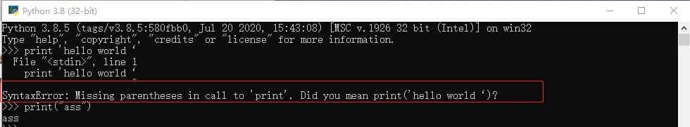 为什么输入命令print Hello World 报SyntaxError: Missing parentheses in call to print . Did you mean print( hello world‘)错 ?