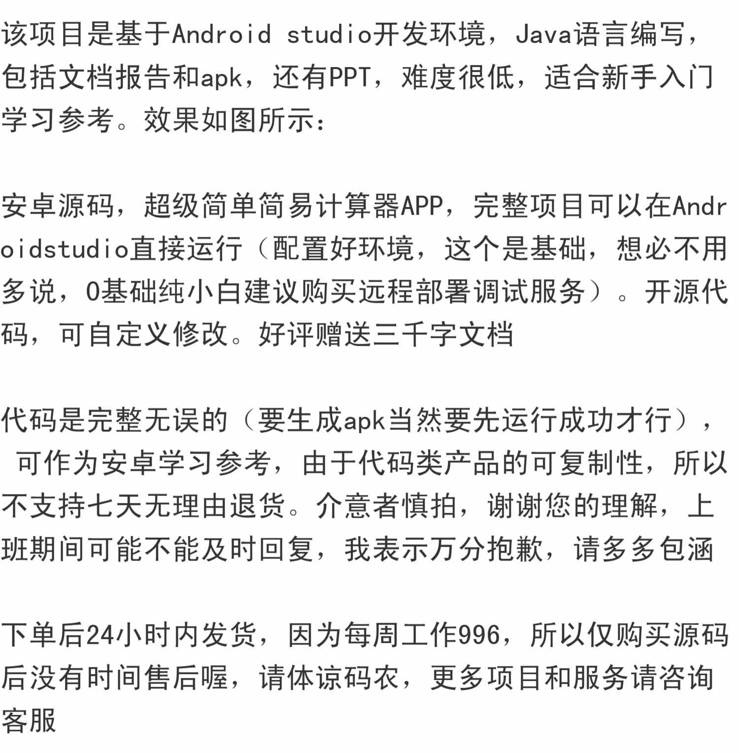 代码是完整无误的(要生成apk当然要先运行成功才行),可作为安卓学习参考,由于代码类产品的可复制性,所以不支持七天无理由退货。介意者慎拍,谢谢您的理解,上班期间可能不能及时回复,我表示万分抱歉,请多多包含涵客服