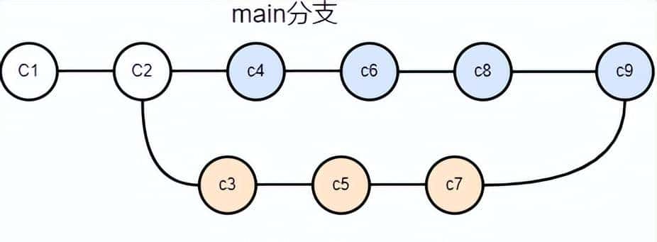 如下图所示,在main分支的c2提交后checkout了一个新分支feature。随后feature分支上提交了c3,c5和c7三个提交。于此同时,main分支也在往前推进,产生了c4,c6,c8三个提交。此时由于feture分支已经开发完毕,向main分支进行合并,在解决完冲突之后,main分支上产生了一个新的提交c9。