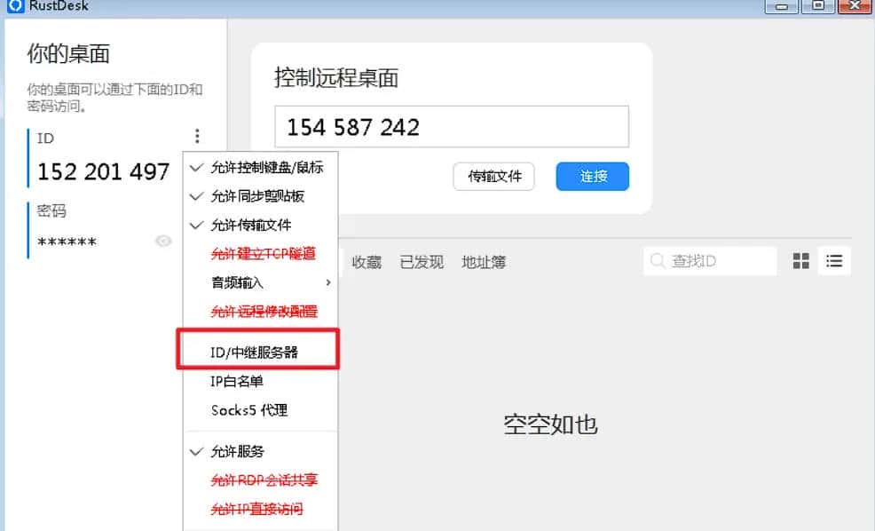 在主界面,依次点击设置-ID/中继服务器,将记录的服务器IP填入ID服务器,key填入Key(key在项目启动目录中)
