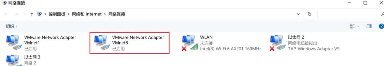 NAT模式,vmware相应地会在宿主机上生成一个虚拟网卡VMware Network Adapter VMnet8,通过以下路径找到此虚拟网卡:控制面板 => 网络和Internet => 网络和共享中心 => 更改适配器设置