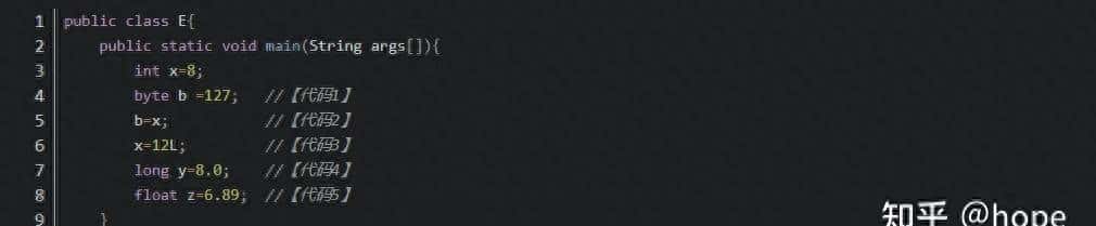 里面代码2错误:由于int转byte,由大转小,需要强制转换。同理代码3 long long 转 int ,代码3不能把浮点类型变量赋给整型变量,代码5需要有后缀 f ,否则就默认是double类型,需要进行强制转换。