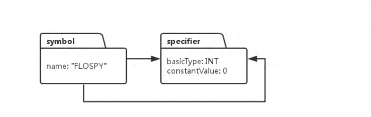 由于FLOSPY没有指针和数组的修饰,因此他的类型系统只需要说明符,不需要修饰符,因此它的类型列表就是由一个specifier,它的数据类型是INT,由于被初始化为一个整形,所以constantValue设置为0,大家注意,从Symbol对象引出两个箭头,两个箭头都指向specifier对象,之所以需要两个箭头,是由于,类型系统本质上是一个链表,链表链接的是两种对象,一种是declarator,一种是specifier,我们在实现代码的时候,需要把declarator放在链表的前面,specifier放在链表的最末尾,因此从symbol发出的两个箭头,一个指向队列的开头,这样从这个箭头开始就可以逐个访问链表的每个对象,由于declarator放在链表的前面,这样从这个箭头开始,就可以访问一系列的declarator,但是如果我们想要访问链表最末尾的元素也就是specifier对象,那就得遍历整个链表,这样效率就太低了,于是从symbol对象引出的第二个箭头直接指向链表的末尾,也就是specifier对象,这样想要直接访问类型系统的specifier对象的话,直接从第二个指针读取就可以了,不需要遍历整个链表。例如下面这个例子: