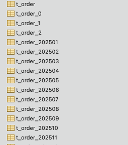 时间分表:t_order_202501、t_order_202502、t_order_202503、......