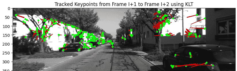 接下来,在 (F_t) 和 (F_{t+1}) 之间寻找特征点的对应关系。这种匹配也可以通过特征跟踪(feature tracking)的方式实现,即从图像 (I_t) 到 (I_{t+1}) 跟踪相同的特征点。