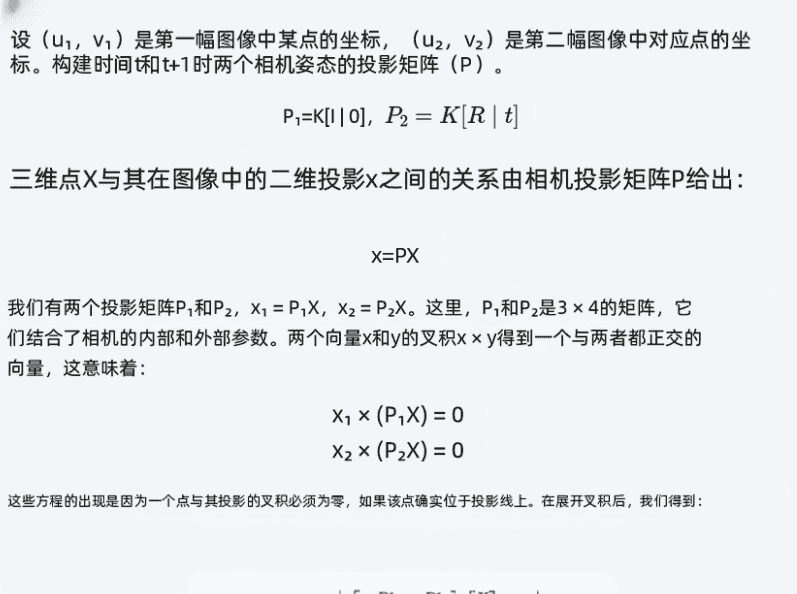 :通过奇异值分解(SVD)从基础矩阵 ( F ) 中恢复相对相机位姿(4×4 齐次变换矩阵),包含旋转 ( R ) 和平移 ( t )。