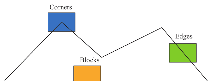 在经典计算机视觉中,这类特征与深度学习中的特征有所不同。经典方法中的特征是人工设计(handcrafted)的,通常以特征点(feature points)的形式表示——即图像中某些具有代表性的特殊位置。以下图为例,我们可以将图像中的角点、边缘和色块等视为典型的代表性区域。
