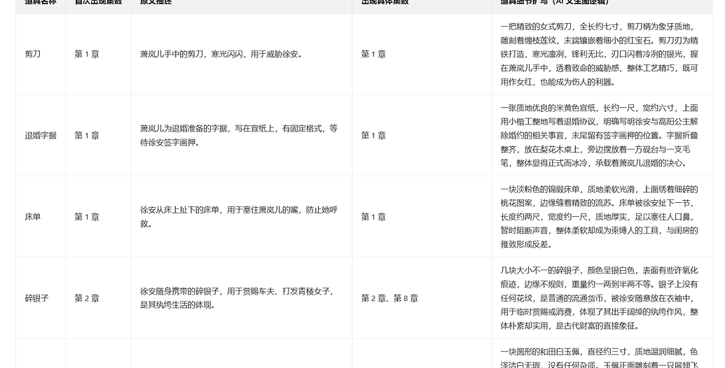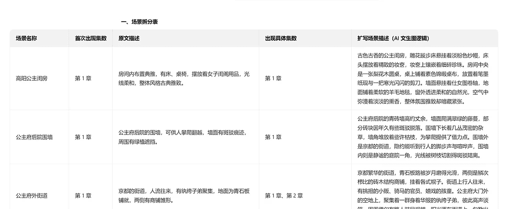 请拆分剧本场景,人物,道具。分别以三个表格形式给我。包括各种虚拟场景。多一列,带上在据本中首次出现的集数和原文的描述。再多一列,带上场景都出现在了哪些具体集数。再多一列,扩写场景描述(用ai文生图的逻辑编写文字)。详细的,仔细点,把所有出现了的场景都写给我。不要有任何遗漏