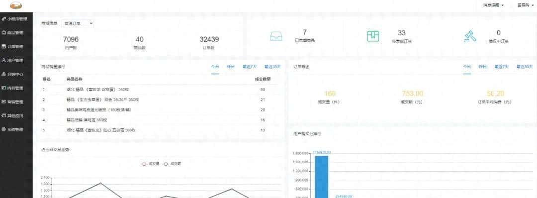 6. 数据统计:支持销售额、订单量、用户行为、商品销量等多维度数据统计分析,并提供可视化图表展示。