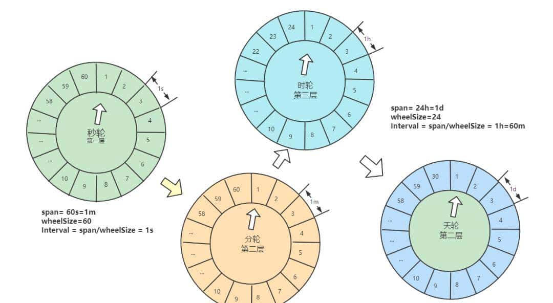 时间轮的二维数组的第一个维度则是具体的时间间隔,分别是秒,分钟,小时,天,4天,但但并没有严格按照时间单位来区分单位,而是根据以上单位最接近的2的整数次幂作为时间间隔,因此在其第一个维度的时间间隔分别是1.07s,1.14m,1.22h,1.63d,6.5d。