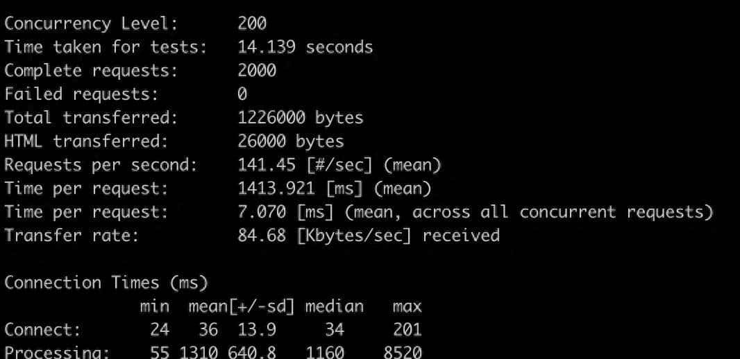 我们进行测试的内容是测试环境的一台2核4G的服务器,使用的 PHP 版本是 PHP7.4 ,正常的 Nginx 及 PHP 配置, ulimit 也都开到了最大。代码只是简单的输出了一行文字,不过我们使用的是一个简单的 mvc 框架 ,也就是说这段代码运行起来至少也会加载几个文件,而不是简简单单的一个文件。