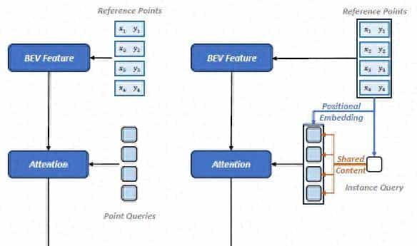 类似DETR的目标检测方法通过一组可学习的查询来预测每个目标的四维边界框信息。正如在DAB-DETR中所证明的那样,解码器中的每个查询都由解码器嵌入(内容信息)和可学习的查询(位置信息)组成。相比之下,高清地图构建一般预测每个地图元素的点集。在许多最先进(SOTA)的方法中,点查询被用来从鸟瞰图(BEV)特征中探测信息,并且每个点查询都预测一个点的位置。然后,将这些预测的点分组以形成检测到的地图元素。尽管在自注意力模块中已经交换和增强了信息,但点查询依旧很难包含整个地图元素的所有内容信息。此外,同一地图元素内的点查询甚至可能具有不同的语义内容信息。我们称这种现象为内容冲突。因此,以前基于点查询的地图构建方法在学习所需内容信息方面存在困难。此外,当前的SOTA方法忽略了位置信息,只是简单地使用随机初始化的可学习查询。