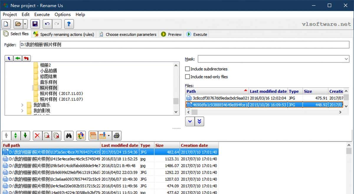 第一,我们要下载并安装Rename Us免费版。然后启动软件,在“Select files”选项卡的左侧窗格导航栏内定位要处理的文件夹。选中文件夹之后,右侧窗格会出现文件列表,默认窗口太小只露出两三个文件,可拖动窗口中部的“……”图标扩大列表。文件列表上方为文件类型选择,勾选“Include subdirectories”可连同子文件夹中的文件一并处理,勾选“Include read-only files”则包含只读文件。选中一个文件后,点击列表下的单箭头图标,将文件添加到下方的重命名窗格中;若点击双箭头图标,则会将当前目录中的所有文件加入(图1)。