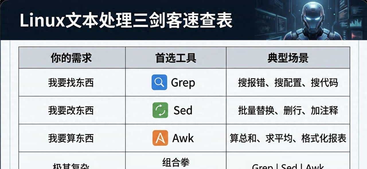 Grep (过滤粗选) –> Sed (清洗规范) –> Awk (分析计算)