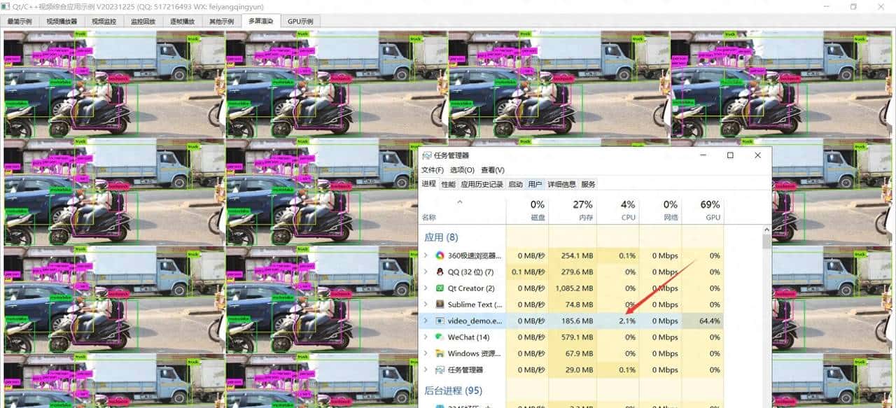 如果是ffmpeg内核或者其他内核转换成了image信号发出来的,可以直接用信号关联到对应窗体即可,如果是mdk内核或者qtav内核,他们提供的都是addrender这种方式,将继承自qopenglwidget或者qglwidget的窗体,添加到需要渲染的队列中就行,要多少个就添加多少,通过opengl绘制视频数据还是超级好的,每增加一个窗体,只是增加部分GPU占用,几乎不会增加CPU占用,要的就是这种效果。