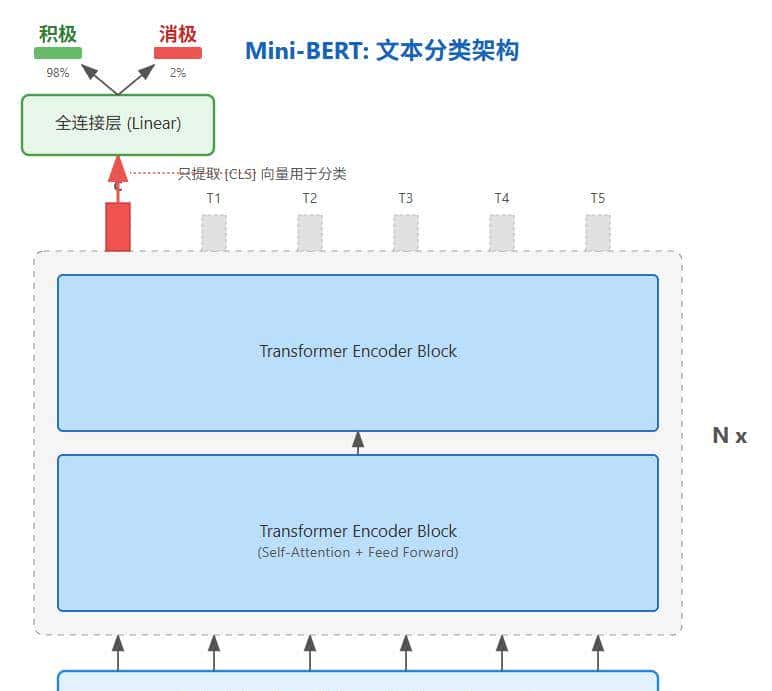 我们的任务是:构建一个“迷你版”的BERT(Mini-BERT),并训练它来完成一项经典的自然语言处理任务——情感分类。即判断一段文本(例如电影评论)是积极的(Positive)还是消极的(Negative)。