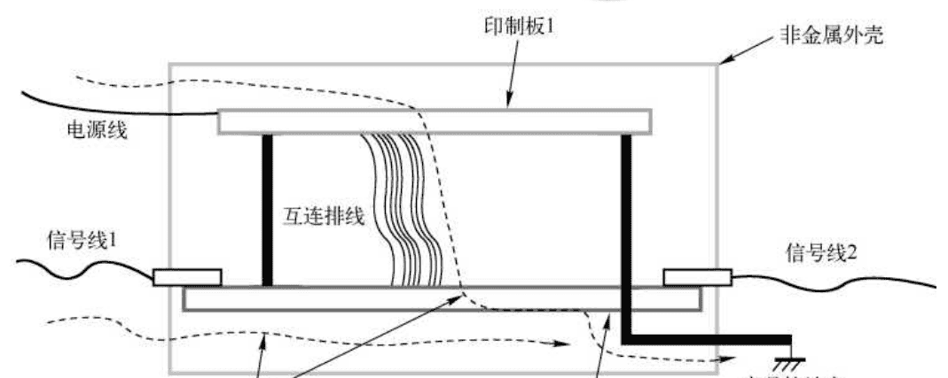 另外, 产品接地点远离电源线和信号线 1,会导致当干扰电流从电源线和信号线1上流过时, 这种共模干扰电流会流经图中印制板和互连排线,又因为互连排线有着较高的阻抗, 这会使得排线两端将有电压变化,这个电压变换可能会使得印制板1和2之间的信号传输产生误码。