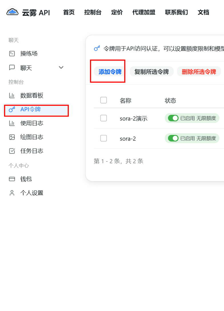 点击侧边栏api,点击添加令牌,创建密钥