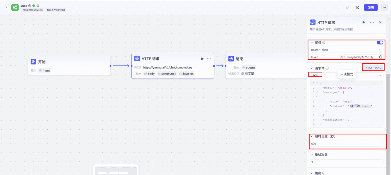 { "model": "sora-2", "messages": [ { "role": "user", "content": "{{block_output_100001.input}}" } ], "temperature": 0.7 }