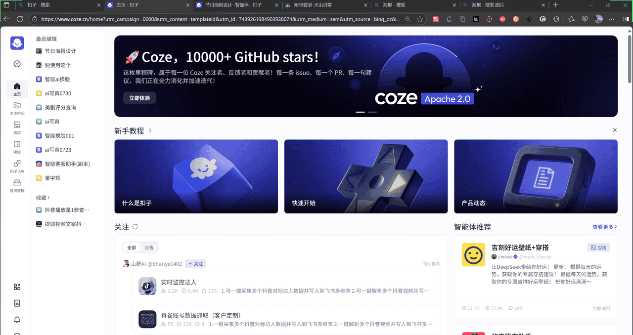 浏览器输入扣子进入如下界面