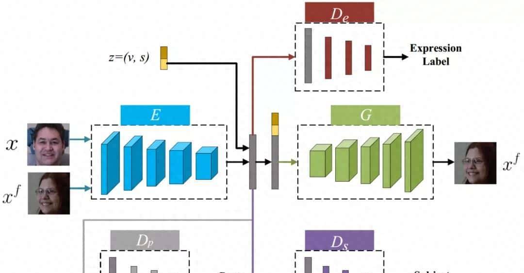之前的研究表明人的头部姿态以及身份都会影响人脸表情识别的效果,头部姿态的改变会让算法难以用统一的模式去识别一样的表情,而一样的身份容易让算法误认为同一个人属于同一类(一样身份有许多人脸特征一样),因此许多研究者针对这两类问题提出了相应的解决方案。但很少有工作能较好地同时解决姿态跟身份带来的问题,所以Wang等人[1]基于对抗学习的思想提出了对姿态和身份较为鲁棒的人脸表情识别方法(如图1所示)。该方法输入一样表情但姿态跟身份不一样的两张人脸,通过对抗学习的方式去除掉姿态跟身份的变化,仅保留表情的特征信息再进行识别,从而达到对姿态和身份都较为鲁棒的目的。
