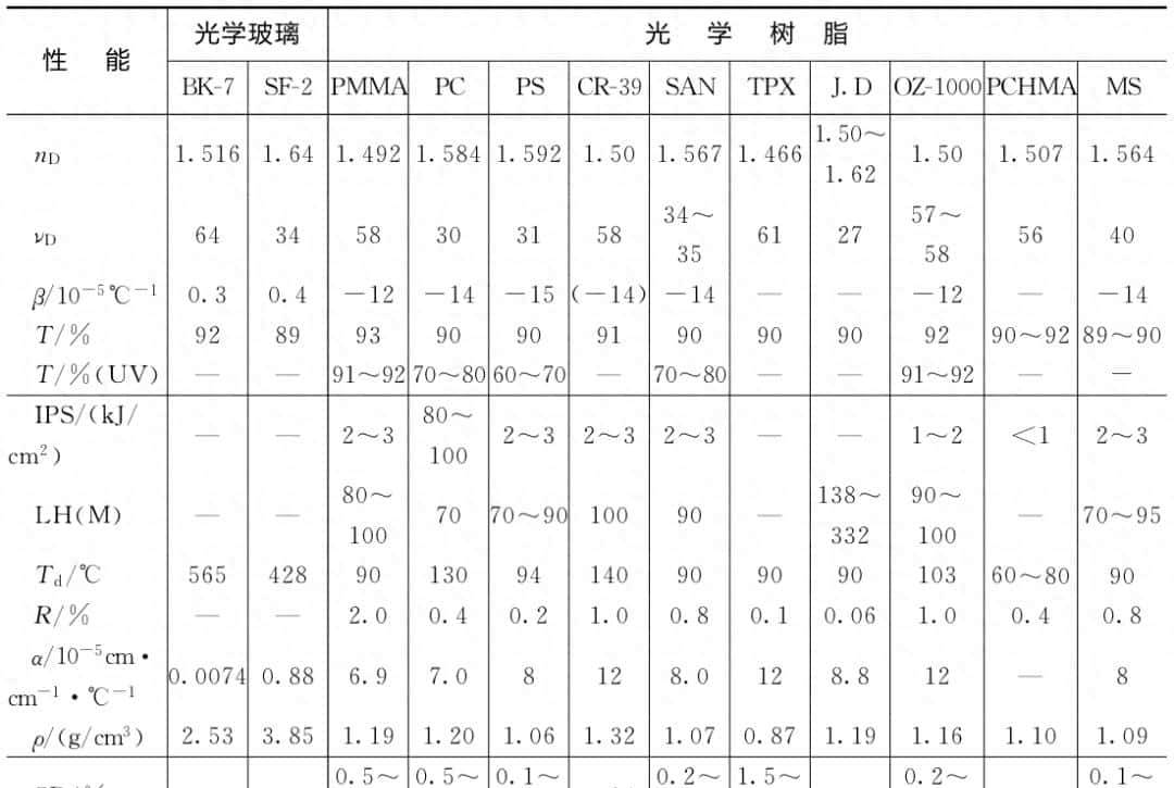 表1一些典型光学树脂的性能与光学玻璃的比较