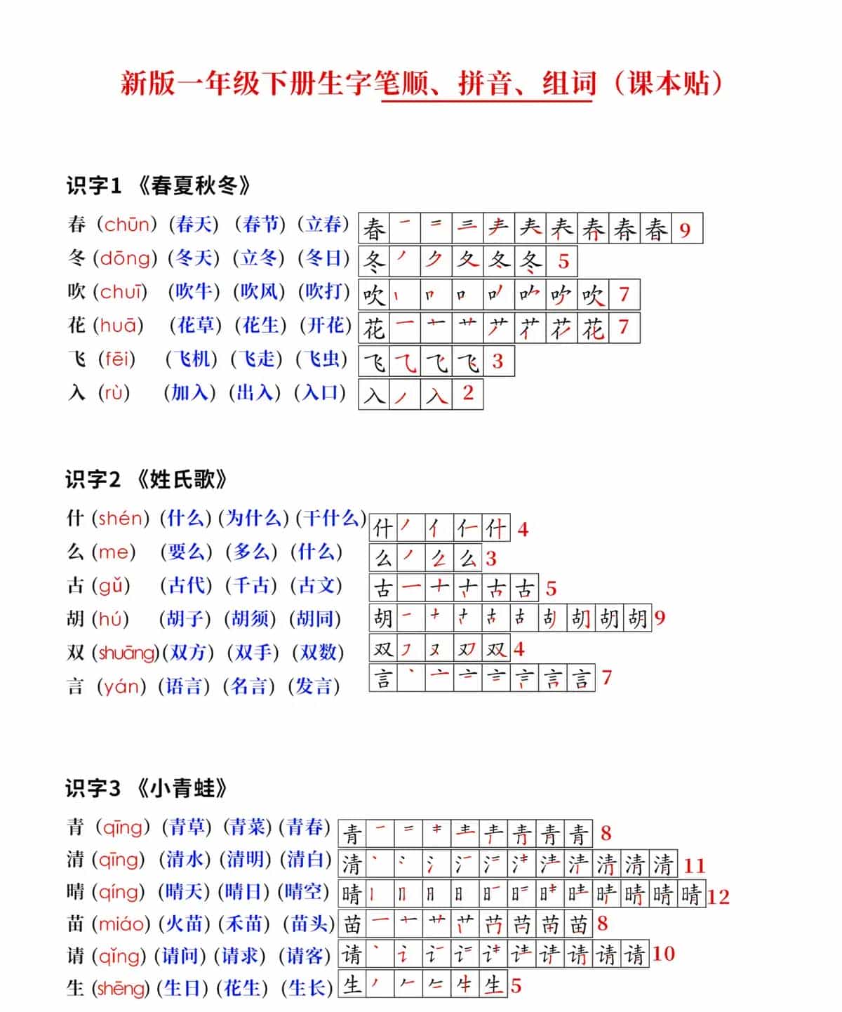 阅读助力:新版一年级下册语文生字笔顺拼音组词(课课贴课本贴)扎实的生字基础,包括准确的拼音、规范的书写和丰富的词汇积累,都能为学生的阅读提供协助。学生在阅读过程中遇到生字时,能够凭借所学知识准确认读和理解,提高阅读的流畅性和理解能力。