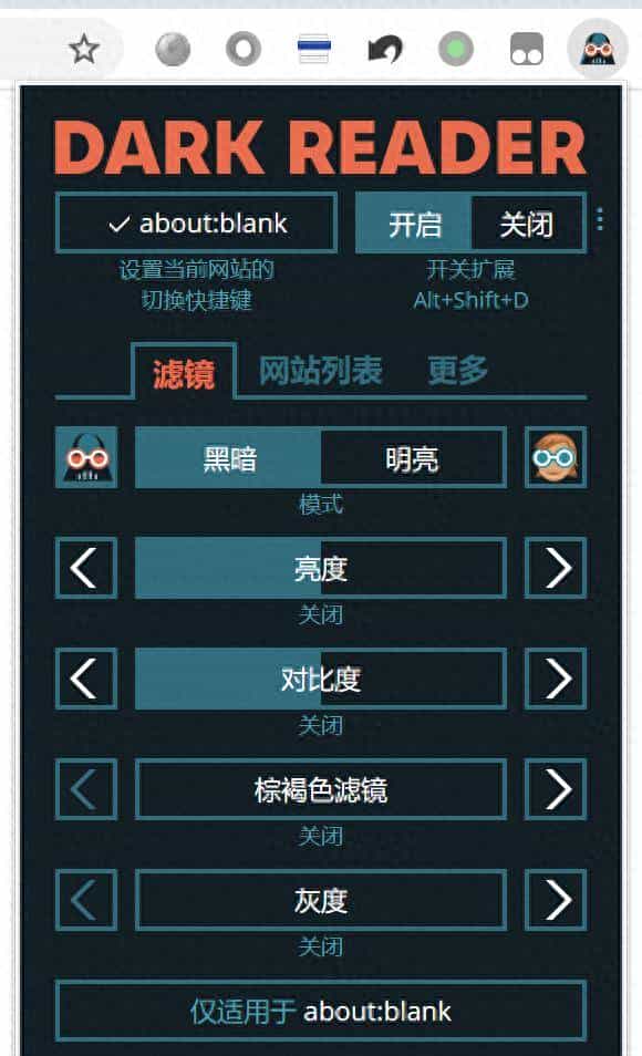 Dark Reader的使用还是很简单的。以Chrome为例,安装后即可在工具栏看到Dark Reader的相应图标。点击后,就可以看到切换夜间模式的选项了。