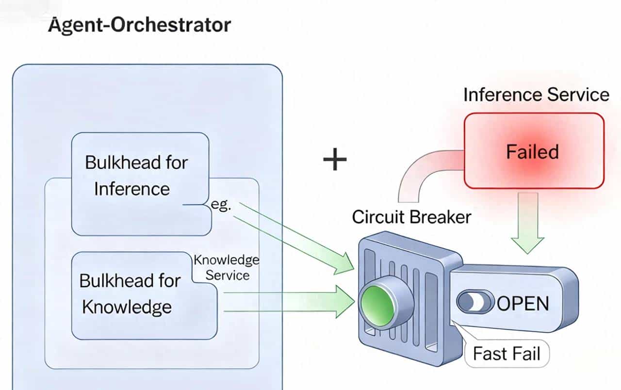 Agent-Orchestrator服务需同时调用Inference-Service、Knowledge-Service及第三方API,这如同大船派出多艘小艇执行任务。错误做法是所有调用共享主线程池,若某艘小艇因对方港口拥堵被困,其他任务也会陷入停滞。