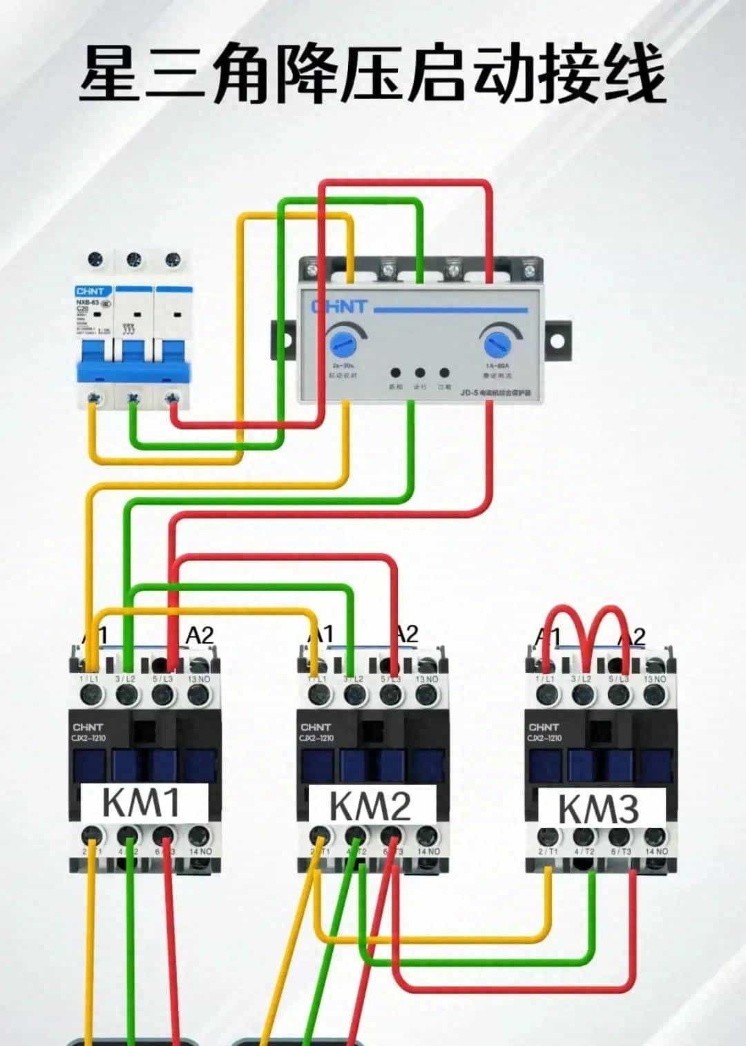 11.星三角降压启动控制实物接线图(三个接触器:主/星/角)