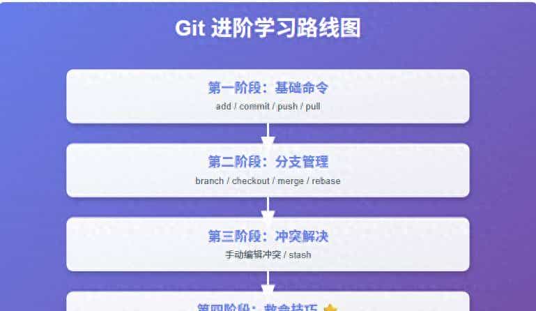 说实话,我之前只会 add、commit、push 三个命令。真遇到突发状况,直接慌了:合并冲突咋办?分支删错了能恢复吗?线上出 bug 怎么快速回滚?