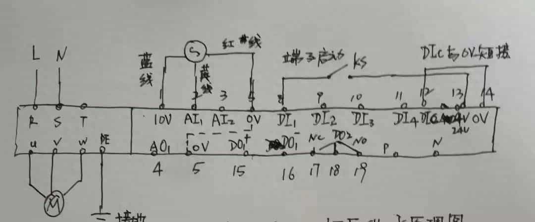 远传压力表两端一端接(蓝线)10v,一端接(红线)0V,中间接(黄线)AI1输出。