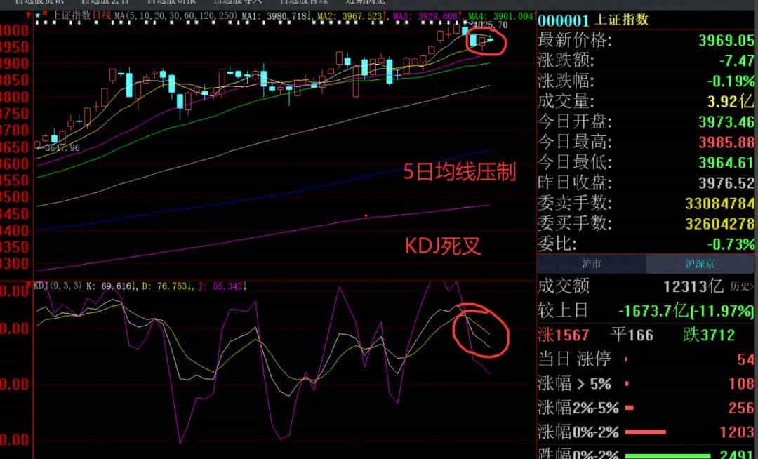 不管是指数还是个股,能不能走强,最起码KDJ金叉状态,站上5日均线,要是KDJ死叉跌破5日均线,代表还要挖坑!