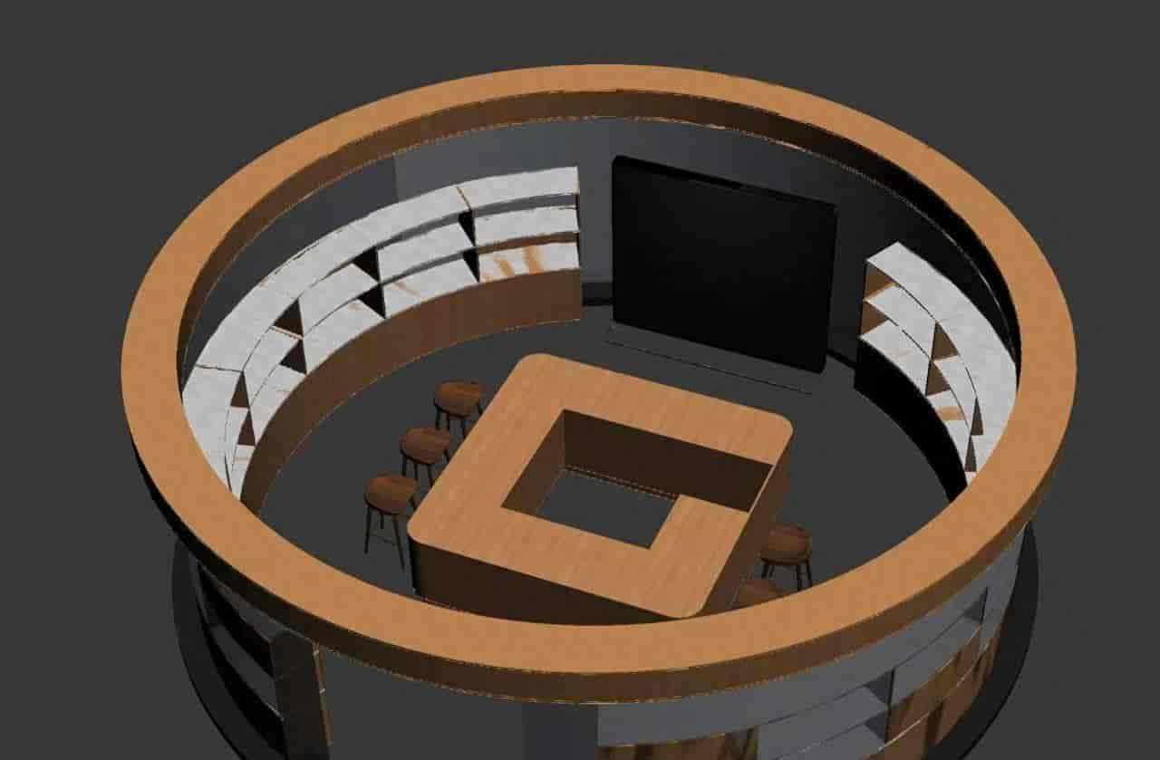 俯瞰视角,环形展柜围成一个圆弧空间,中央是一个四边形的接待柜台。(在最开始的几次生成过程中,一直是六边形纠正不过来)展架上摆放着蜂蜜罐、酒瓶等商品样品,墙面挂着几幅装饰画。整体色调偏暖木色,光线柔和自然。