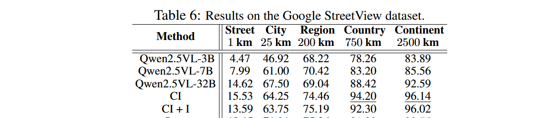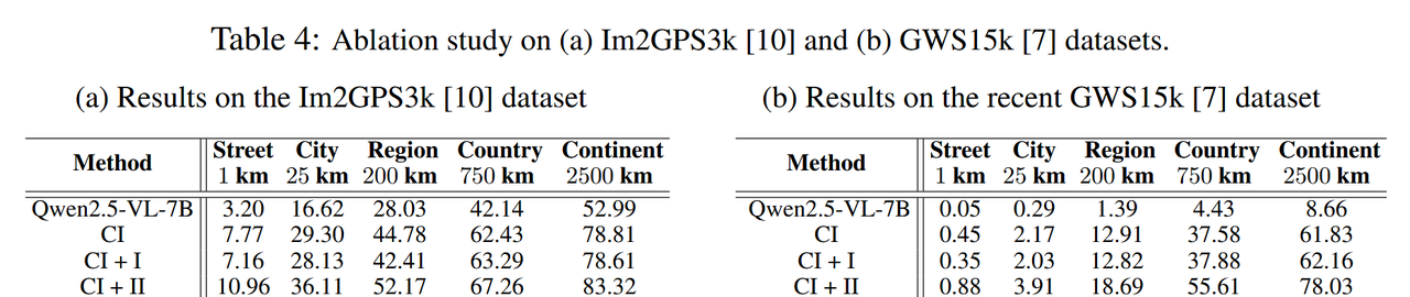 我们还在 Google StreetView 数据集(表 6)上进行了评估,观察到了类似的性能趋势。此外,我们展示了我们的基础模型 Qwen-2.5VL 系列在 Im2GPS3k 和 GWS15k 数据集(表 7)上的性能。这些结果与主要结果的结论一致,进一步验证了我们提出的训练策略的有效性。