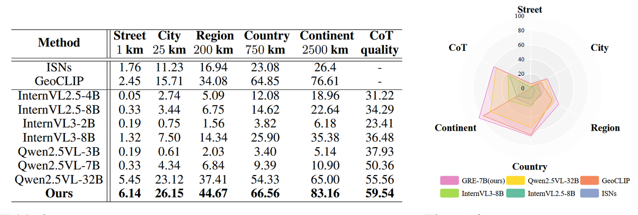 • 我们提出了GRE,这是一个面向全球图像地理定位任务的新颖推理解决方案。我们提出的方法结合了冷启动初始化与两阶段强化学习训练范式,有效地利用图像中的地理标识,并实现开放式地理定位。