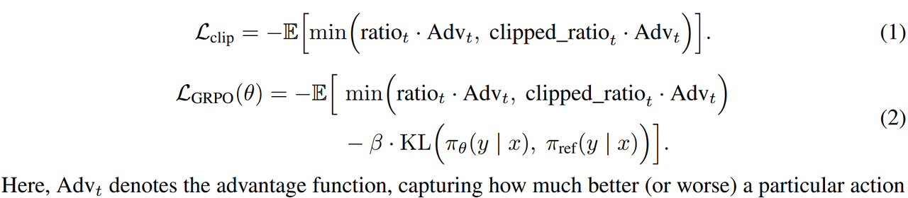 我们使用GRPO以一种可控的方式实现一致性策略更新与强健奖励信号的平衡整合。对于生成输出中的每个标记,GRPO首先计算新策略(πθ)和参考策略(πref)下的对数概率。然后,它计算概率比值并将其裁剪到[1 − ε, 1 + ε]范围内,以限制策略更新并避免发散。归一化奖励(作为优势估计处理)随后被用于类似PPO的损失函数中,将策略优化与KL散度(以β作为权重)正则化相结合: