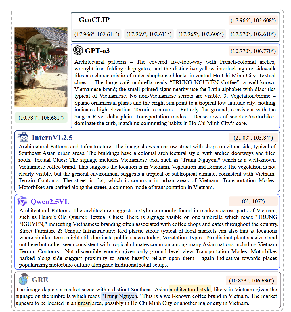 数据源:从 MP16-Pro 数据集(含街景图像 + GPS 坐标)中抽样作为 “地理种子”,但该数据集仅含基础图像和坐标,缺乏推理过程;利用 GPT-o3(具备强思维链生成能力),通过精心设计的 Prompt(如 “先识别建筑风格、再解码路牌文字、最后匹配地形”),为每个种子样本生成 “图像 – CoT – 坐标” triples(例如:图像中 “HSBC 分行 + 美式车牌”→推理链 “建筑风格像纽约 + 车辆符合美国特征”→坐标 “40.742, -73.985”.