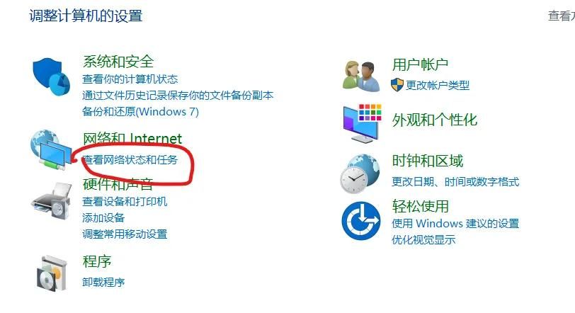 1、鼠标左键点击桌面左下角的,在弹出的菜单在搜索中搜索“控制面板”,然后在新弹出的Windows控制面板中点击【网络和Internet】的查看网络状态和任务。