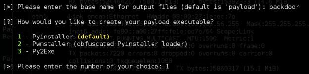 接下来,它会让我们输入载荷的名称,我将其命名为“backdoor”。如上面提及的,Veil会把python文件转为exe,它询问我们选择什么工具来转换。我个人而言,喜爱Pyinstaller,我输入1选择它。这两步如下图所示