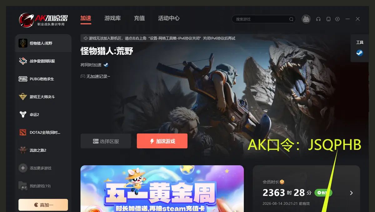 目前,就为大家揭晓AK加速器PC端的兑换码:JSQPHB、AK7878、AK6868、AK8989、niaoshuo。这些兑换码就像是一把把神奇的钥匙,能为你开启免费加速时长的大门,让你在《怪物猎人:荒野》的世界里尽情驰骋,无需再为网络问题而担忧。