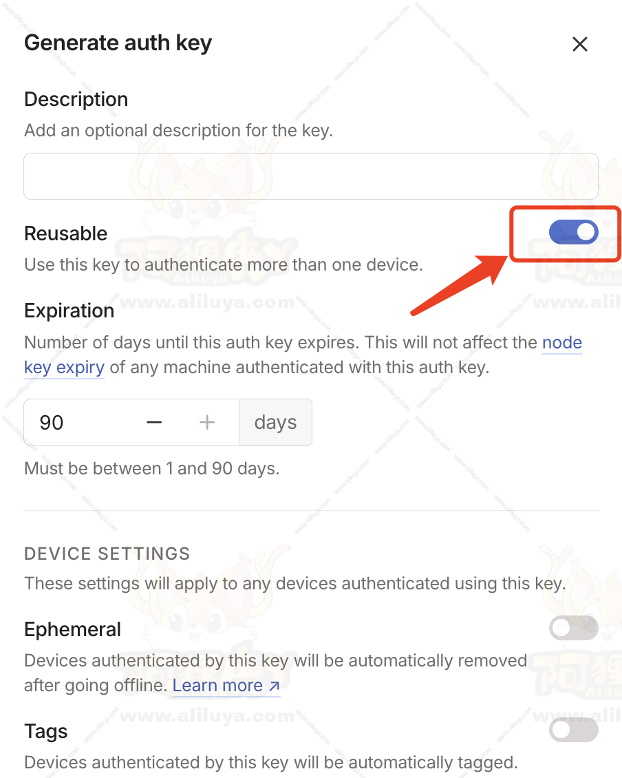 弹出生成密钥对话框,打开【Reusable】的开关,表示可重复使用此密钥,可以验证多个设备。然后直接点击【Generate key】生成密钥。