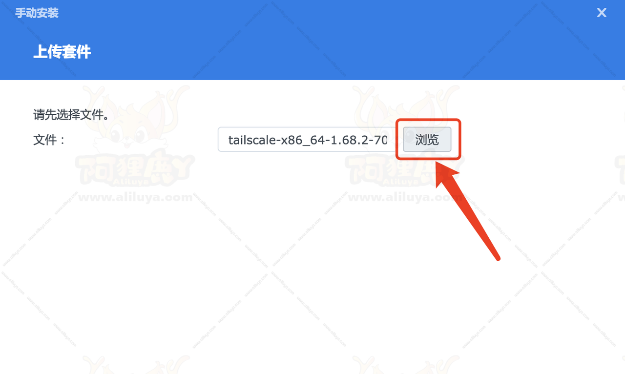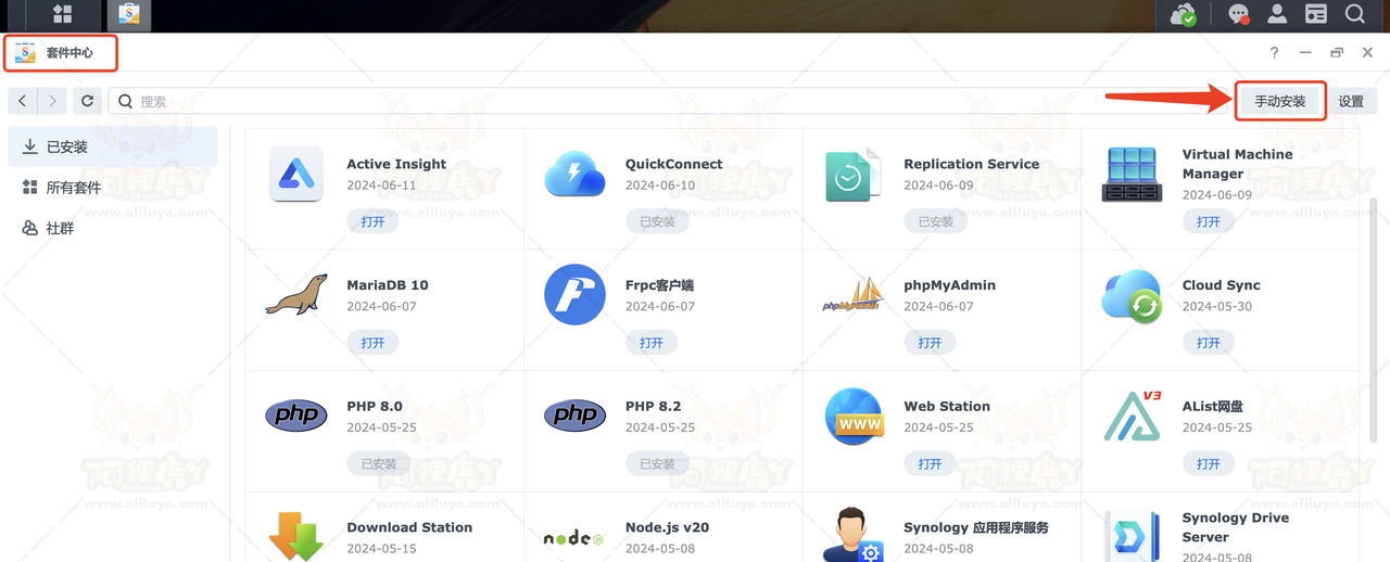 下载完成之后,回到群晖后台打开套件中心,点击手动安装。